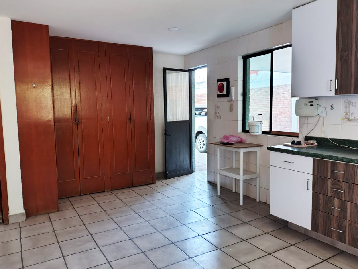 Cocina integral con espacio para antecomedor y alacena.