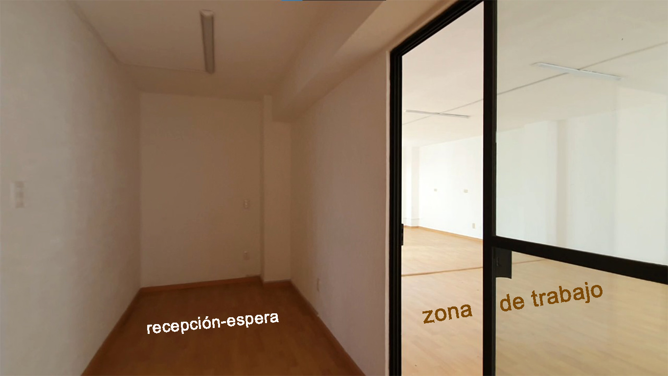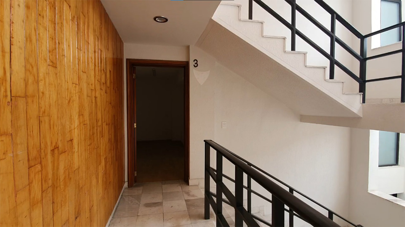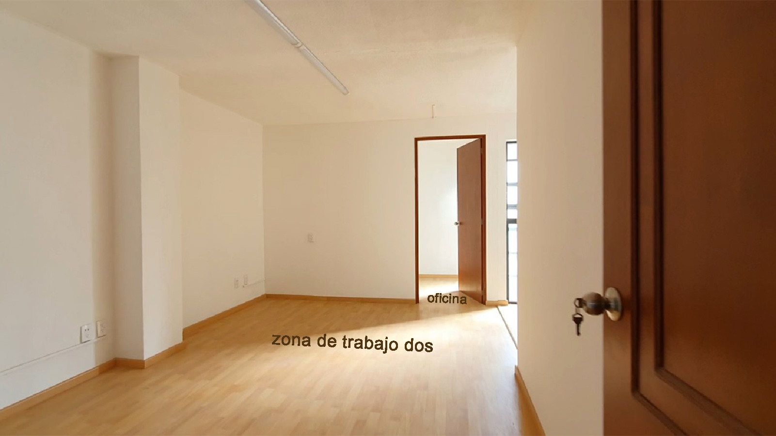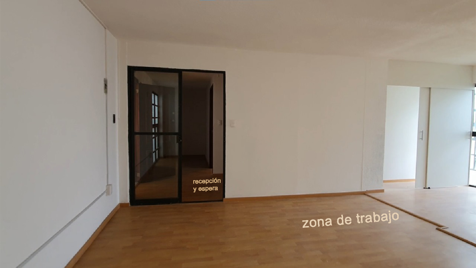 La oficina en renta se ubica en un tercer medio nivel, tiene una superficie de 87.7 metros cuadrados, tiene cubiculos y espacios abiertos, ademas de un medio baño propio.