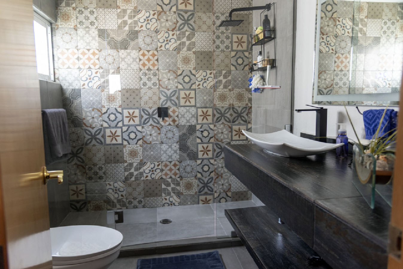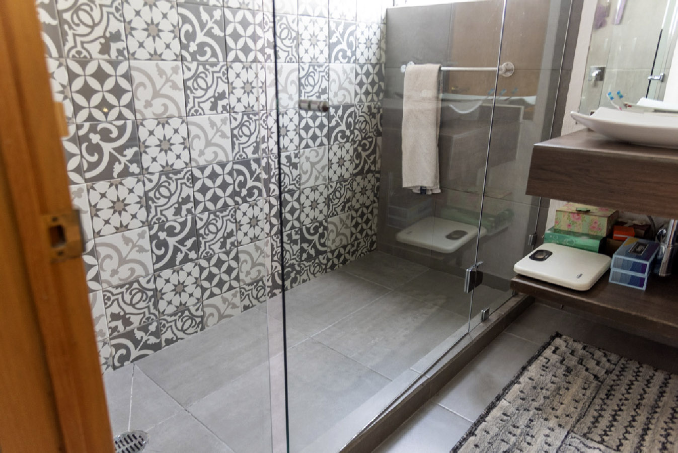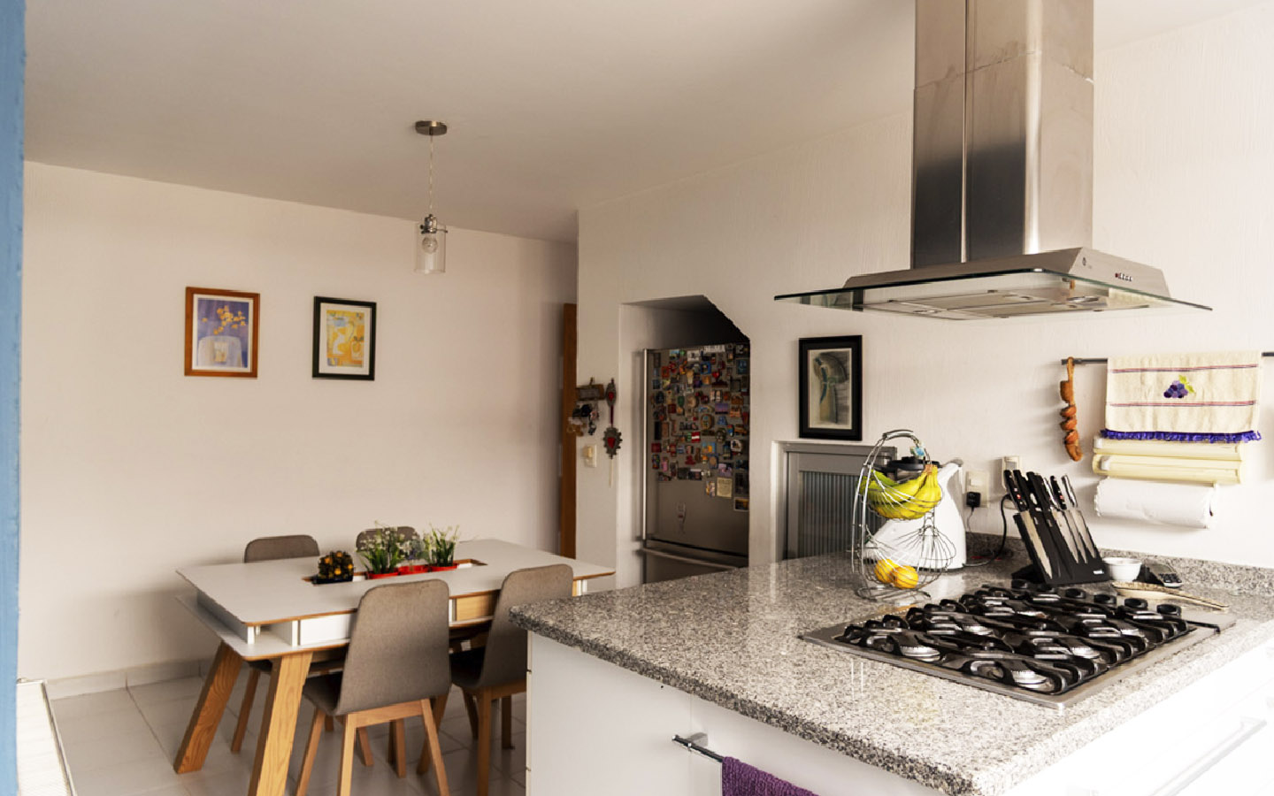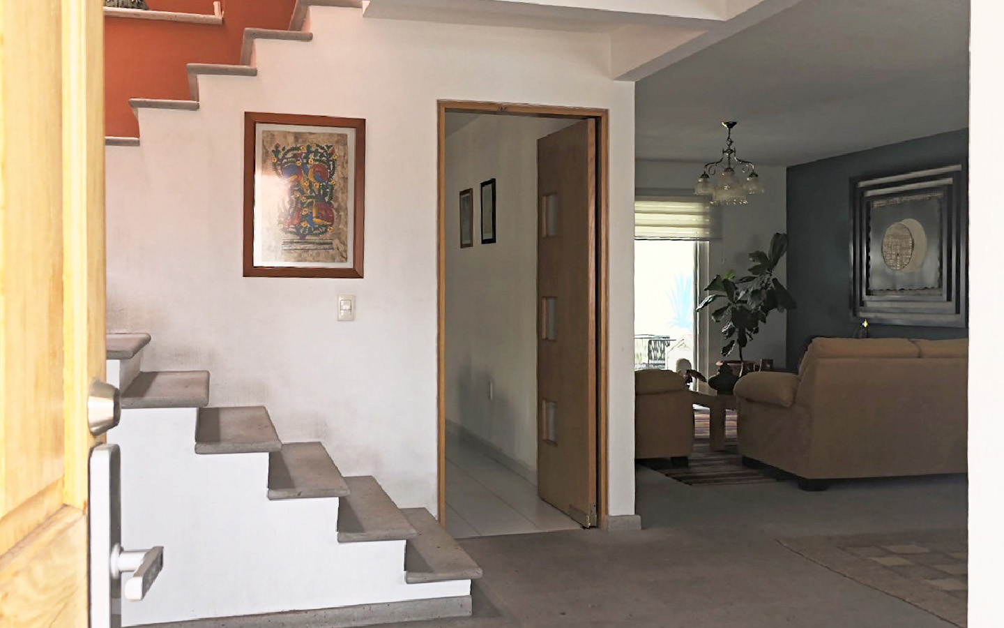 Acabados: piso de cantera gris en áreas sociales, medio baño y escaleras; loseta cerámica en cocina y zona de servicio.