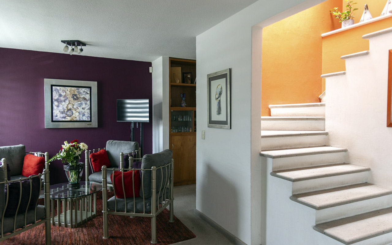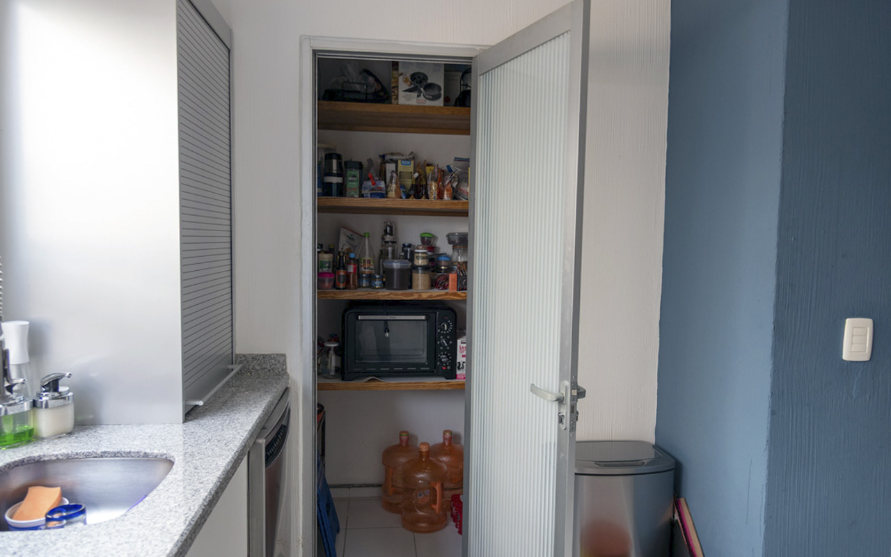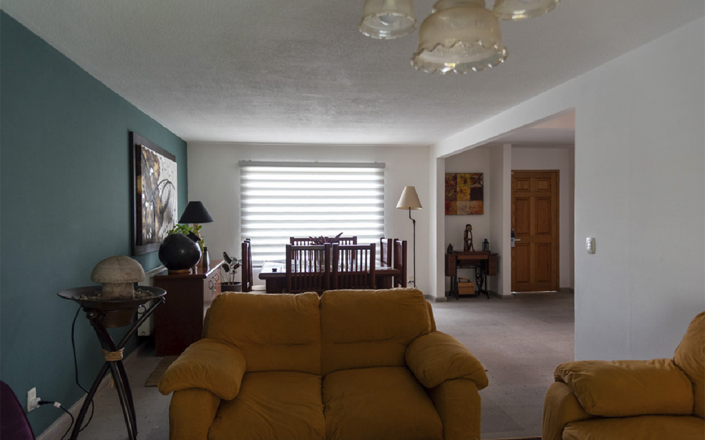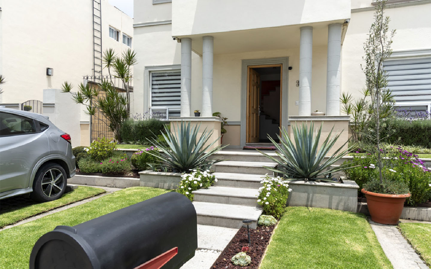 Acabados: piso de cantera gris en áreas sociales, medio baño y escaleras; loseta cerámica en cocina y zona de servicio.