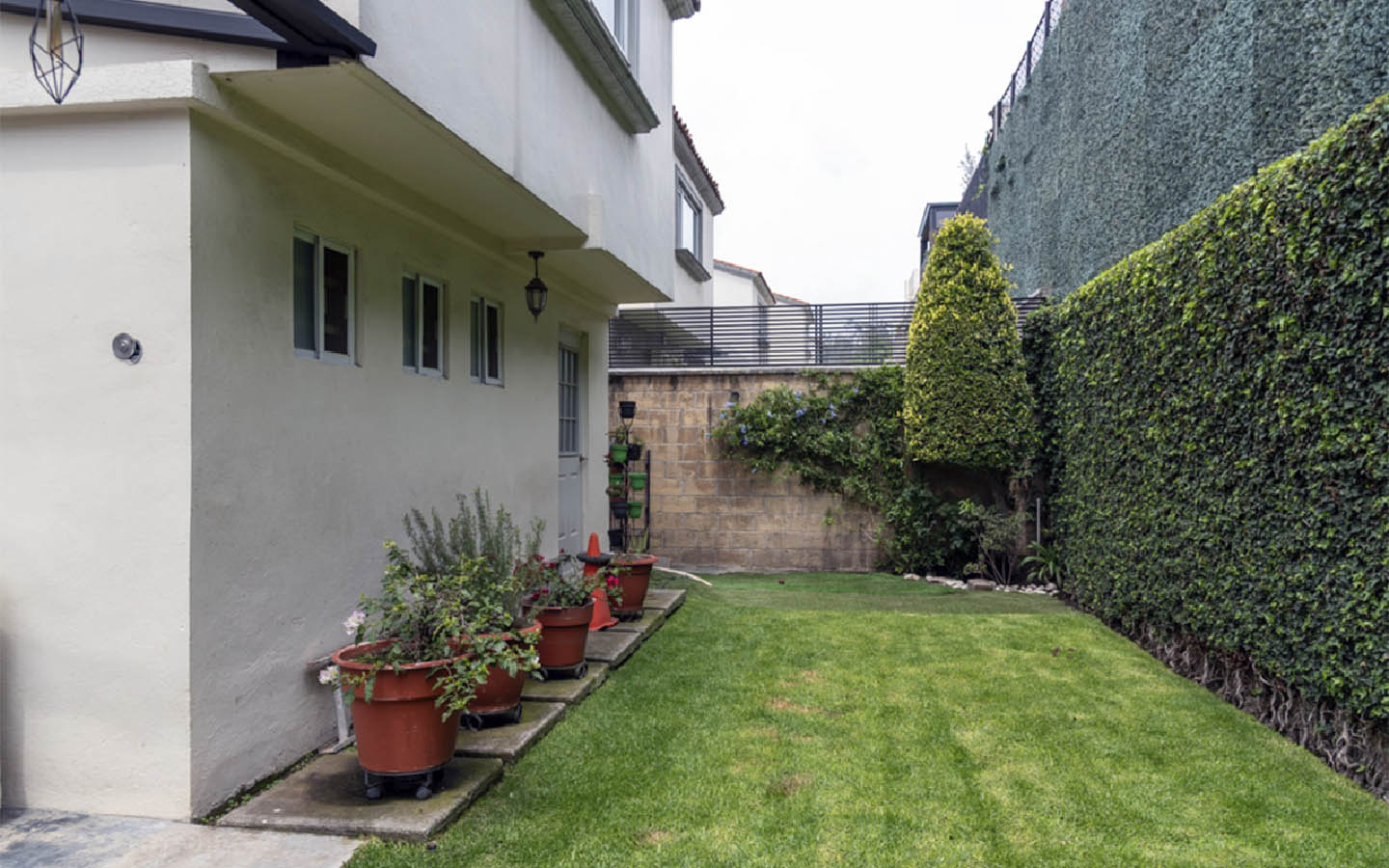 Planta baja: estacionamiento para dos autos, jardín y jardineras al frente, vestíbulo de acceso, sala recibidor, sala–comedor, cocina integral con cava, antecomedor, alacena, medio baño, terraza techada con cristal templado, jardín posterior de 45 m², cuarto de lavado y cuarto de servicio con baño completo.